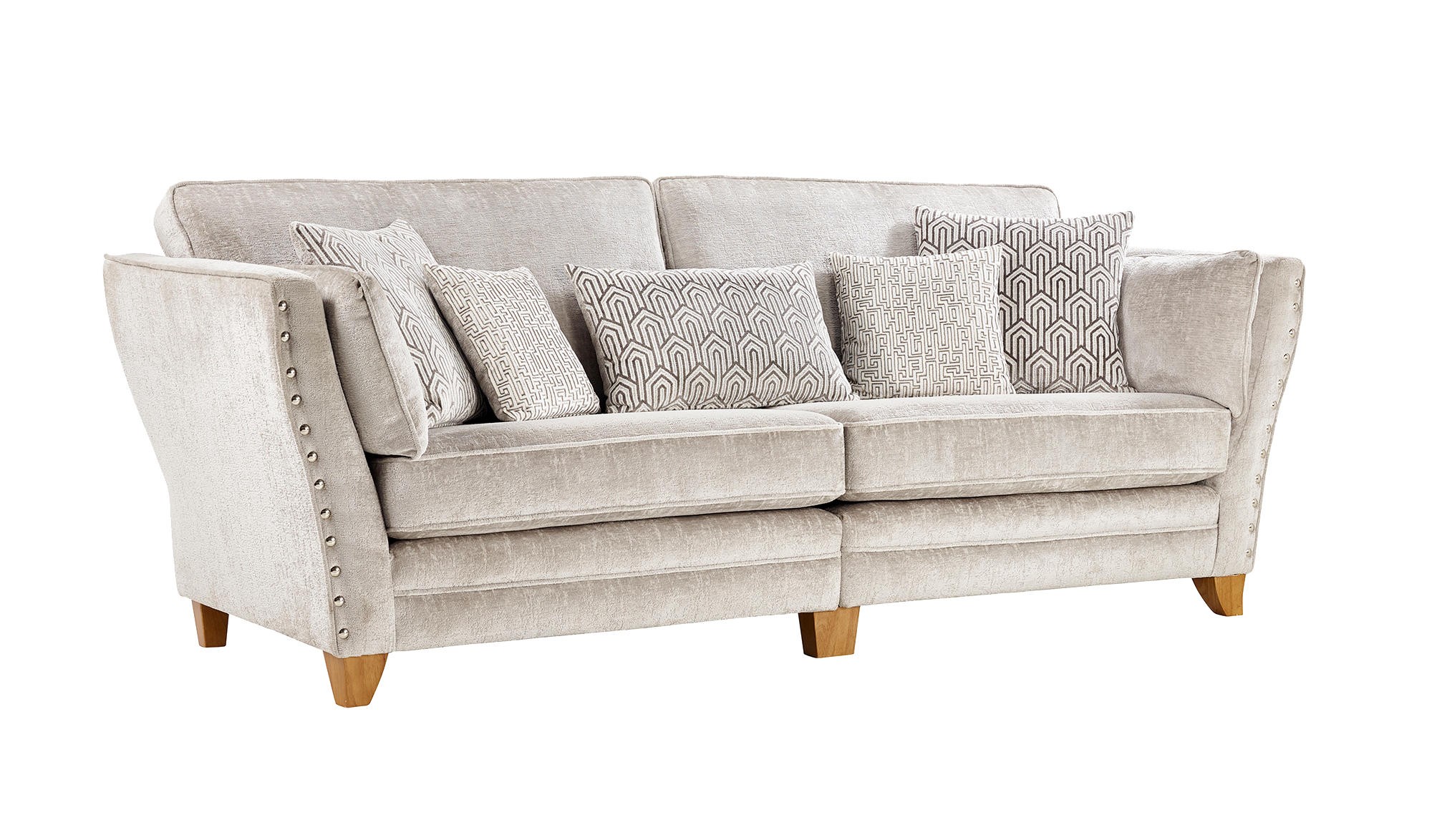 High arms cushioned by soft bolsters to wrap you in stylish comfort, the glorious finishing touches are the stunning metal studs shinning like jewels.